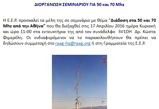 Την Κυριακή 17 Απριλίου η ΕΕΡ διοργανώνει σεμινάριο για 6 και 4 μέτρα. Ο Κώστας SV1DH θα μοιραστεί την γνώση του μαζί με τους ενδιαφερόμενους. Πριν μια δεκαετία είχα την τύχη να παρακολουθήσω σεμινάριο για τα 6 και 2 μέτρα από τον Κώστα. Πρόκειται για επιστημονική προσέγγιση και μια εργασία πάνω από 30 χρόνια. Καλό θα ήταν να μην το χάσει κανείς!!